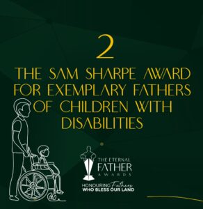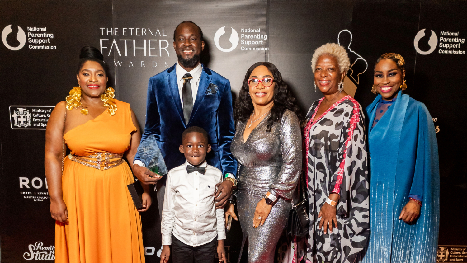 He is photographed here with his son Khelani and sponsors, Kaysia Kerr, CEO of the National Parenting Support Commission (Presenting Sponsor); Karen Smith D’aguilar, CEO Signature Style/Clarks Jamaica; Sandra Samuels, CEO, Totally Male, and Founder & President of the Eternal Father Awards Anna Smith